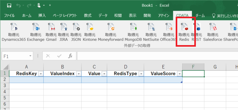 インストール後、Excelを起動し、CDataタブから[接続元Redis]をクリックします。