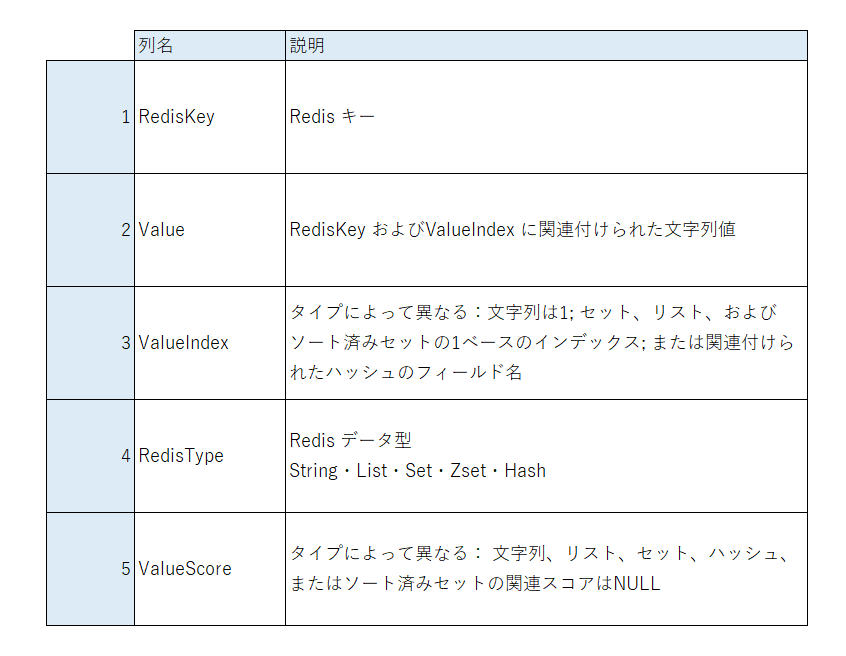 ちなみに、Cdata Redis Driverのカラムはシンプルです。下記の5種類しかありません。