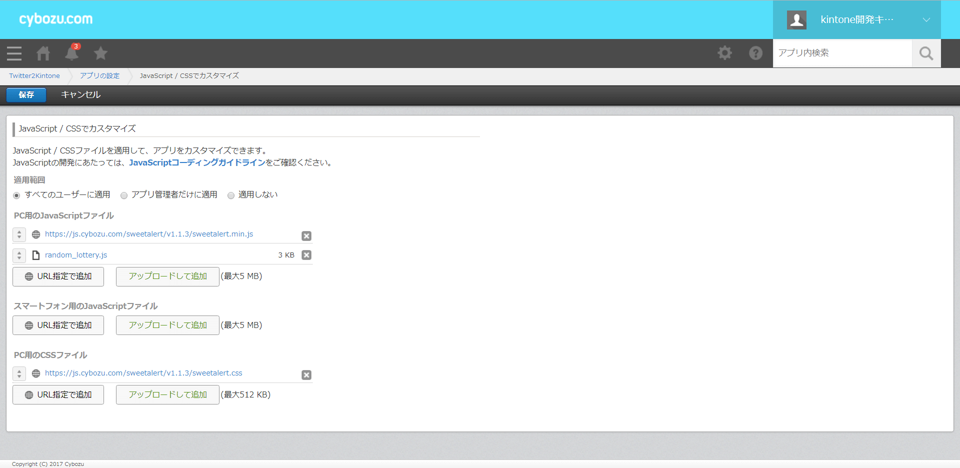 本アプリでは、2つのJavascriptライブラリとCSSを利用しています。下記のページよりダウンロードして「JavaScript / CSSでカスタマイズ」に追加してください。