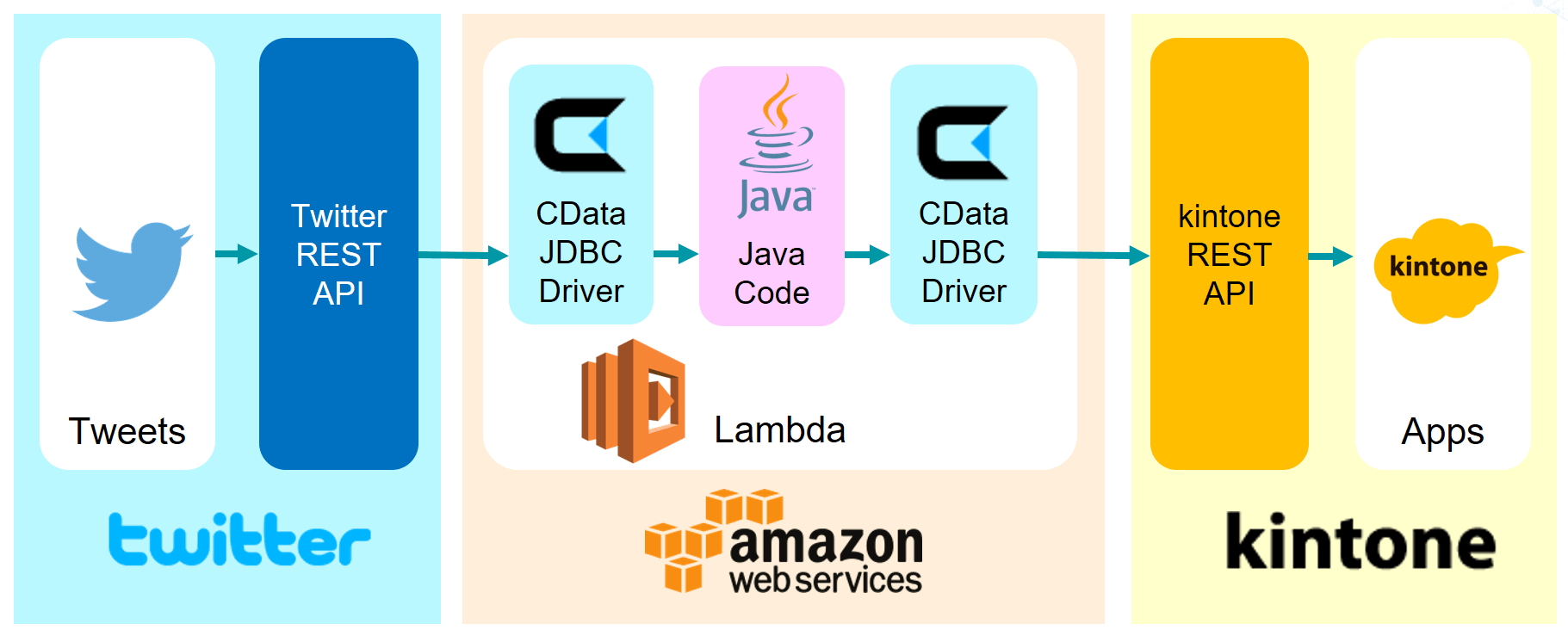 本記事では、AWS LambdaとCData Driversを使って、Twitterの特定ハッシュタグのツイート情報をサイボウズ社のkintoneに蓄積するアプリケーションを例に、サーバーレスなFaas(Function as a service)でマルチクラウド間のデータ連携を実現する方法をご紹介します。