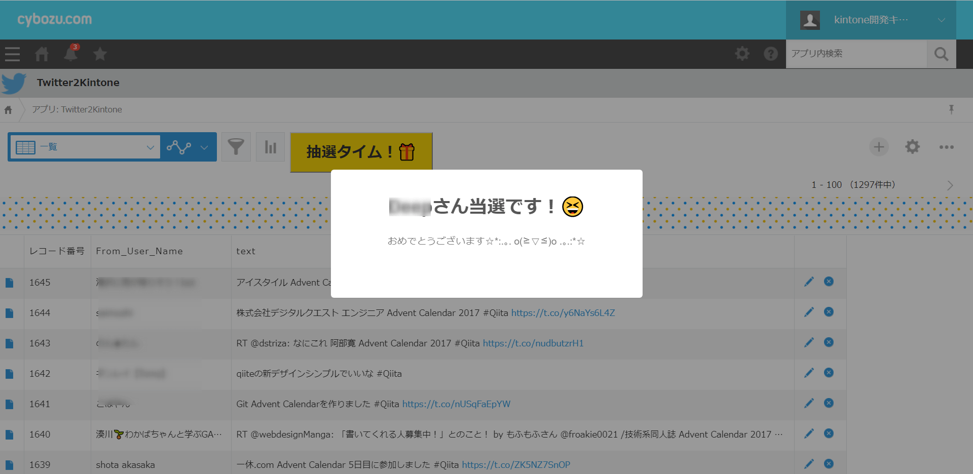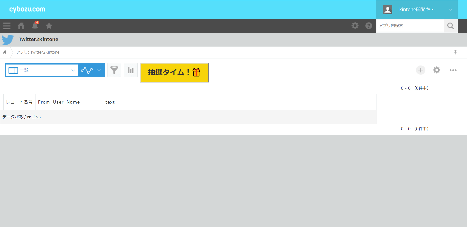 それでは、kintoneのアプリを開いてみましょう。ツイート内容が登録されていれば成功です。