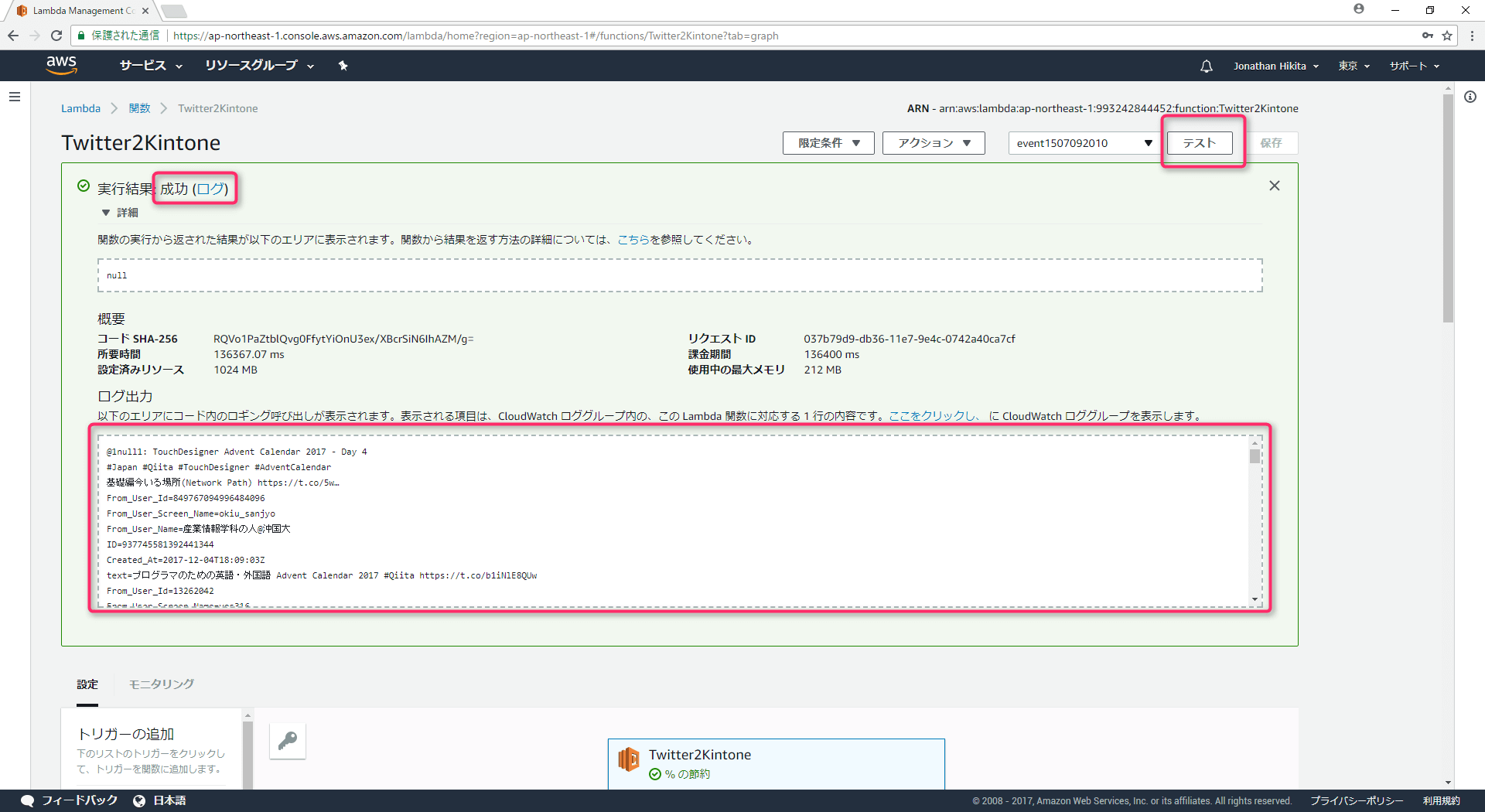 それでは、AWS Lambda上でジョブのテスト実行を行ってみましょう。作成した関数の左上の「テスト」ボタンをクリックします。しばらくすると、実行結果、および、ログを確認できます。ログの内容を見ると、指定したハッシュタグのツイート情報が出力されていることがわかります。