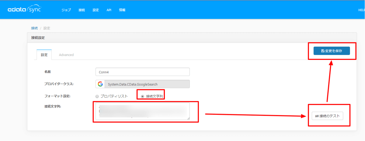 次に接続設定です。Google Searchのアイコンをクリックすると、以下のような画面が表示されるので「接続文字列」のラジオボタンをクリックし、事前に入手していた情報を元に以下のような接続文字列を入力します。