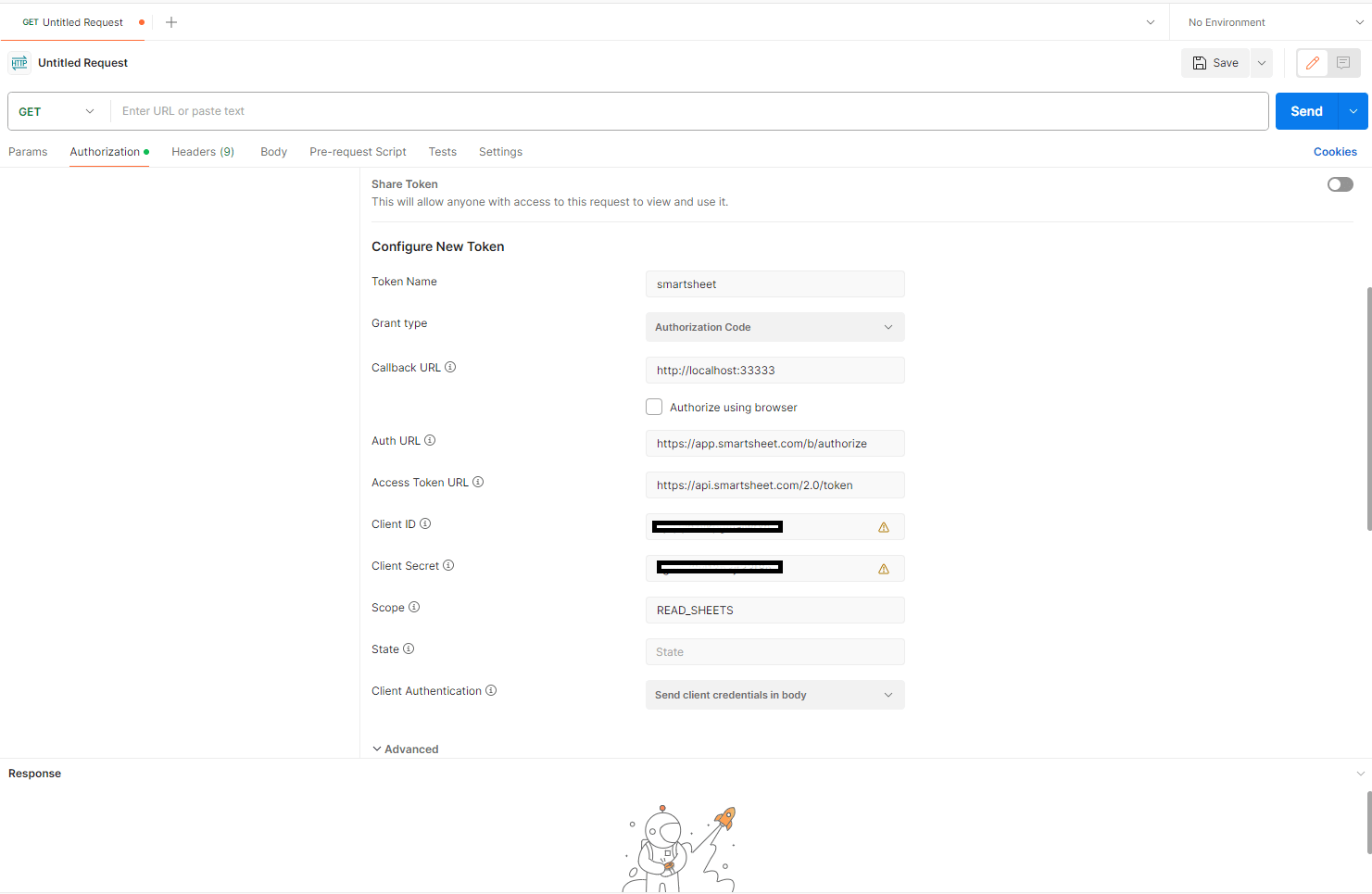 Auth URL やAccess Token URL はドキュメントを参照:https://smartsheet.redoc.ly/#section/OAuth-Walkthrough