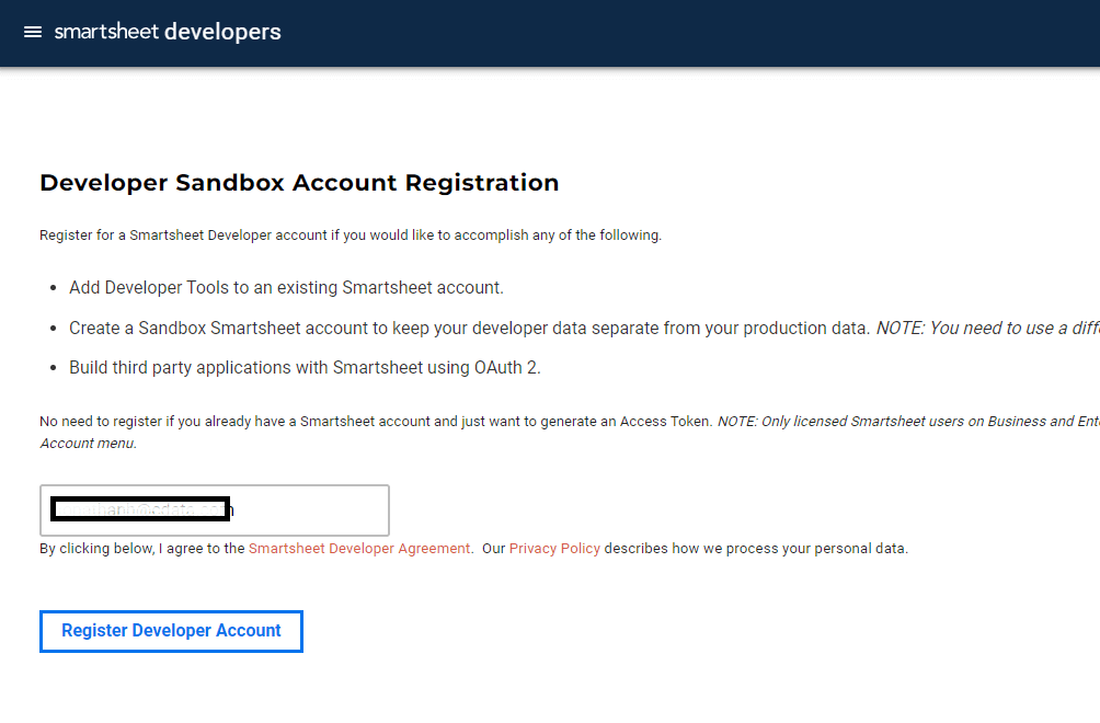 Developer Sandbox Account Registration 画面が開くので、メールアドレスを登録して、[Register Developer Account]ボタンをクリックします。