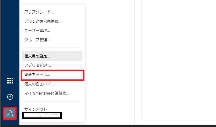 まずは、Smartsheet の左下のアカウントから[開発者ツール] をクリックします。