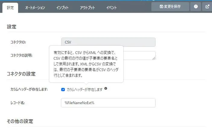 列ヘッダを含んだCSV に変換したいので「カラムヘッダーが存在します」を有効にします。あとはデフォルトの設定で保存します。
