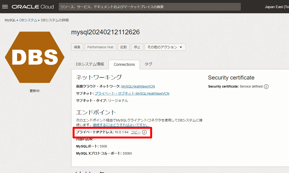 併せてMySQL HeatWave の環境も構成しておきます。上記コンピュートインスタンスからプライベートIPアドレスで接続できる状態にしておきました。