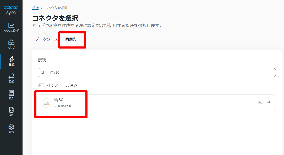 同期先から「MySQL」を選択しましょう。