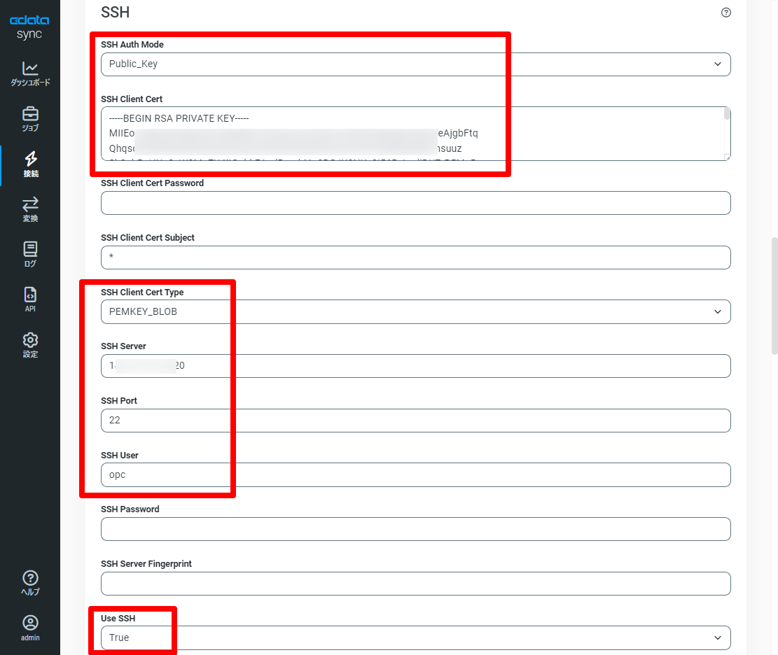 「高度な設定」タブに移動し、SSHの設定から以下の通り情報を入力すればOKです。SSH の接続設定は環境に併せて調整してください。
