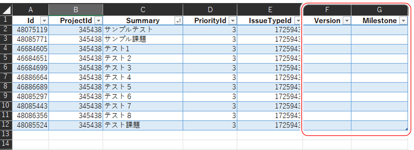 データを取得すると以下のようにVersion, Milestone のカラムが表示されますが、これらはデータの取得をサポートしていないため、発生バージョンやマイルストーンを持っていたとしてもシートには表示されません。