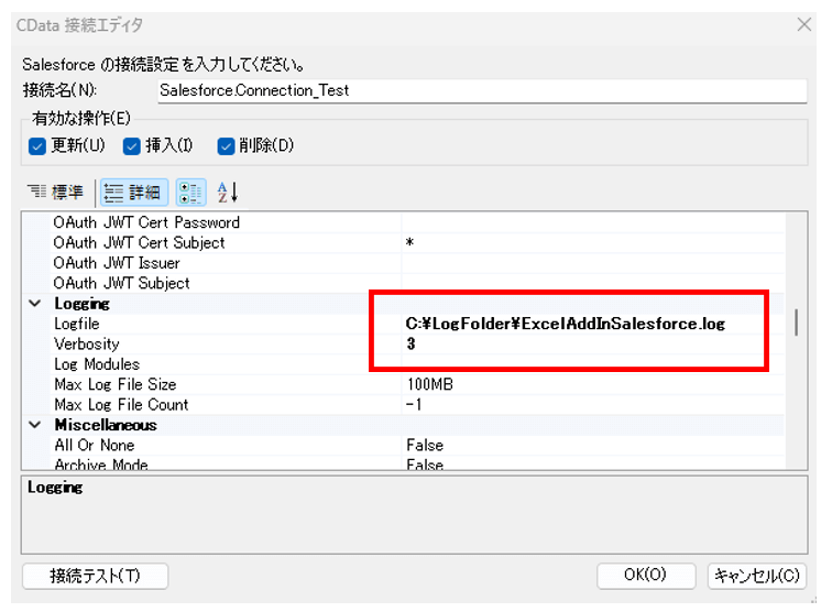 その後、接続設定>詳細>Loggingの順で進み、下記の2つの項目に設定値を入力します。