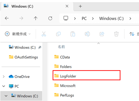 まずは、Cドライブに「LogFolder」を新規作成します。