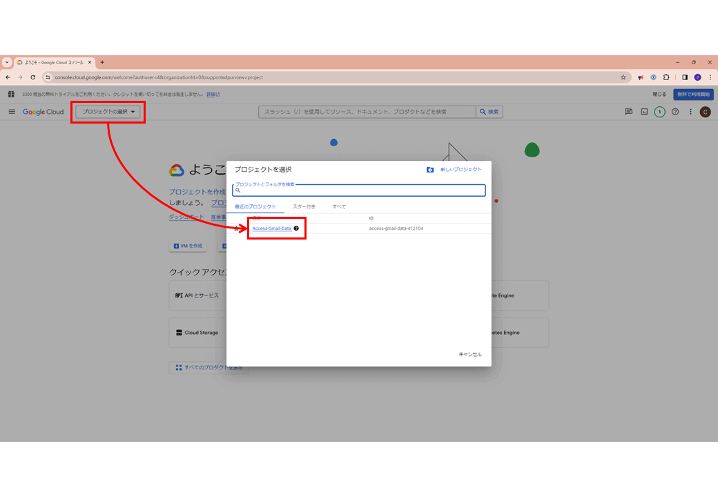 4.[プロジェクトの選択]で手順3で作成したプロジェクトをクリックします。