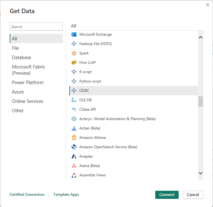 Select ODBC from the list of data sources.