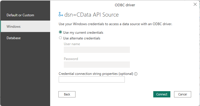 Next, an authentication screen will be displayed, but the authentication information for JODOO is included in ODBC DSN, so there is no need to specify it here. Select "Use my current credentials" under "Windows" and click "Connect".