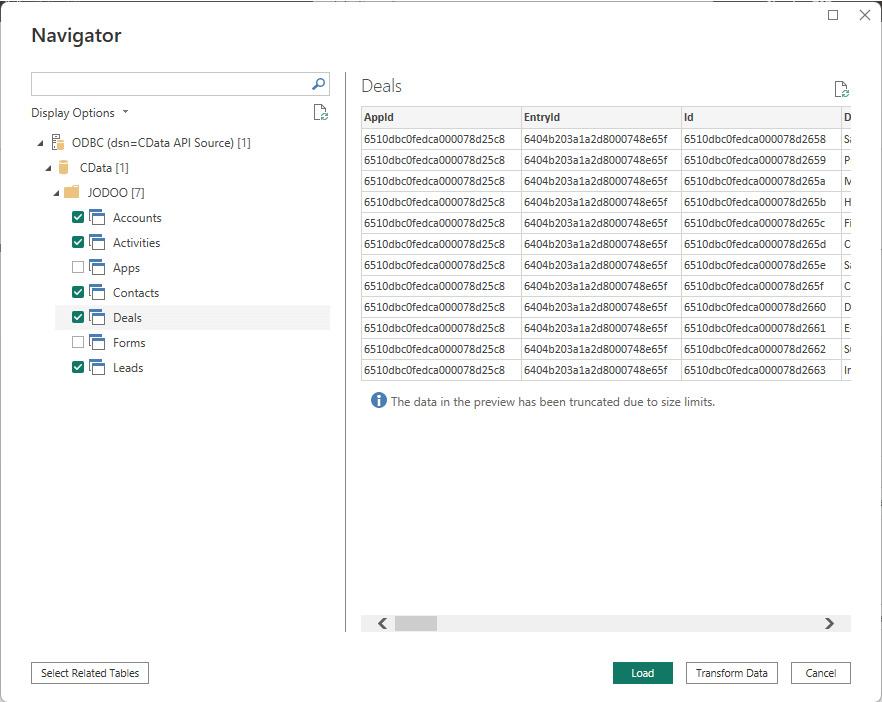 When you move to the Navigator screen, you will see a list of the data models you checked on the ODBC DSN screen earlier, so select the JODOO app/form you want to get and click "Load."
