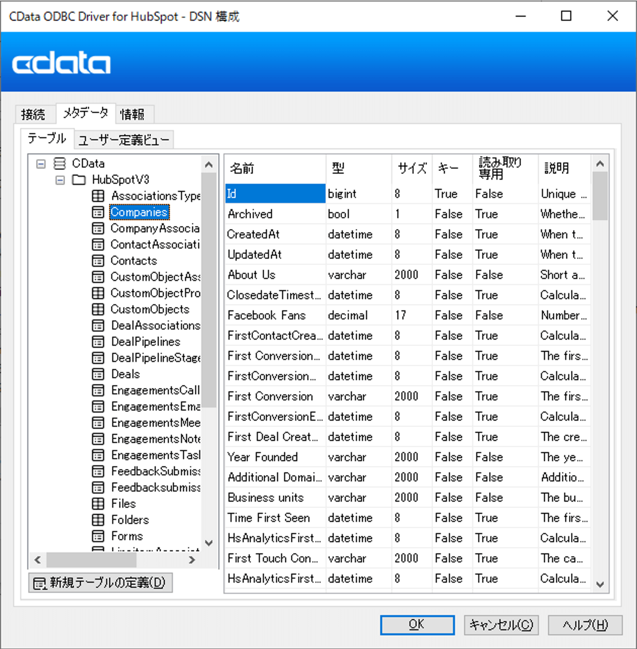 接続テスト完了後、「メタデータ」のタブに移動することで、HubSpot ODBC Driver で利用できるテーブルやビューが確認できます。
