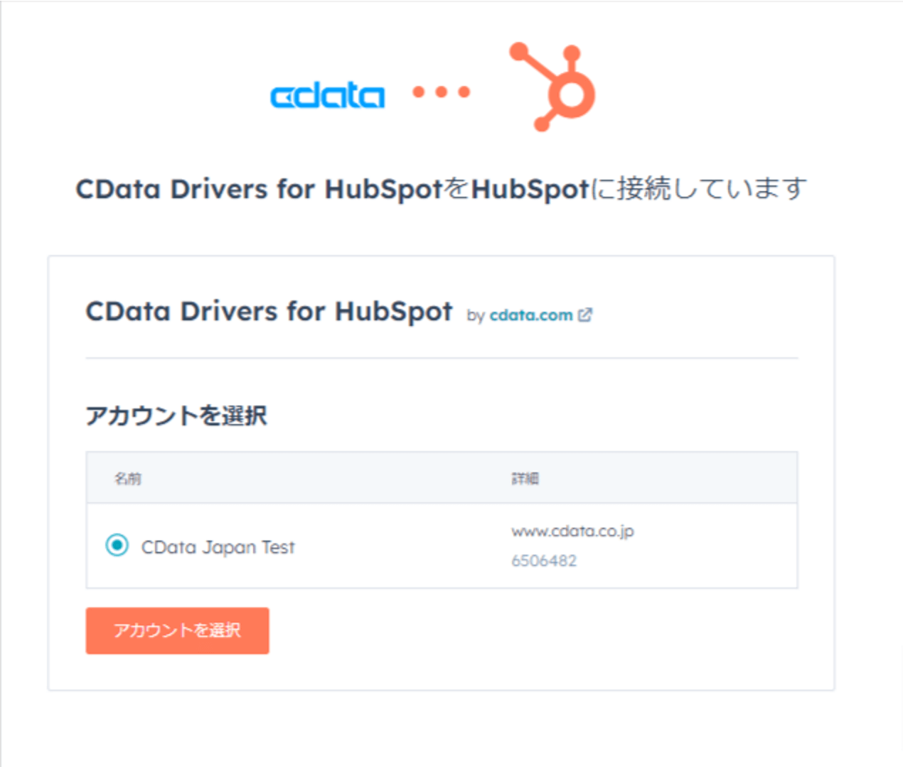以下のようにブラウザでHubSpot へのログインおよびアカウント選択画面が表示されるので、任意のアカウントを選択し
