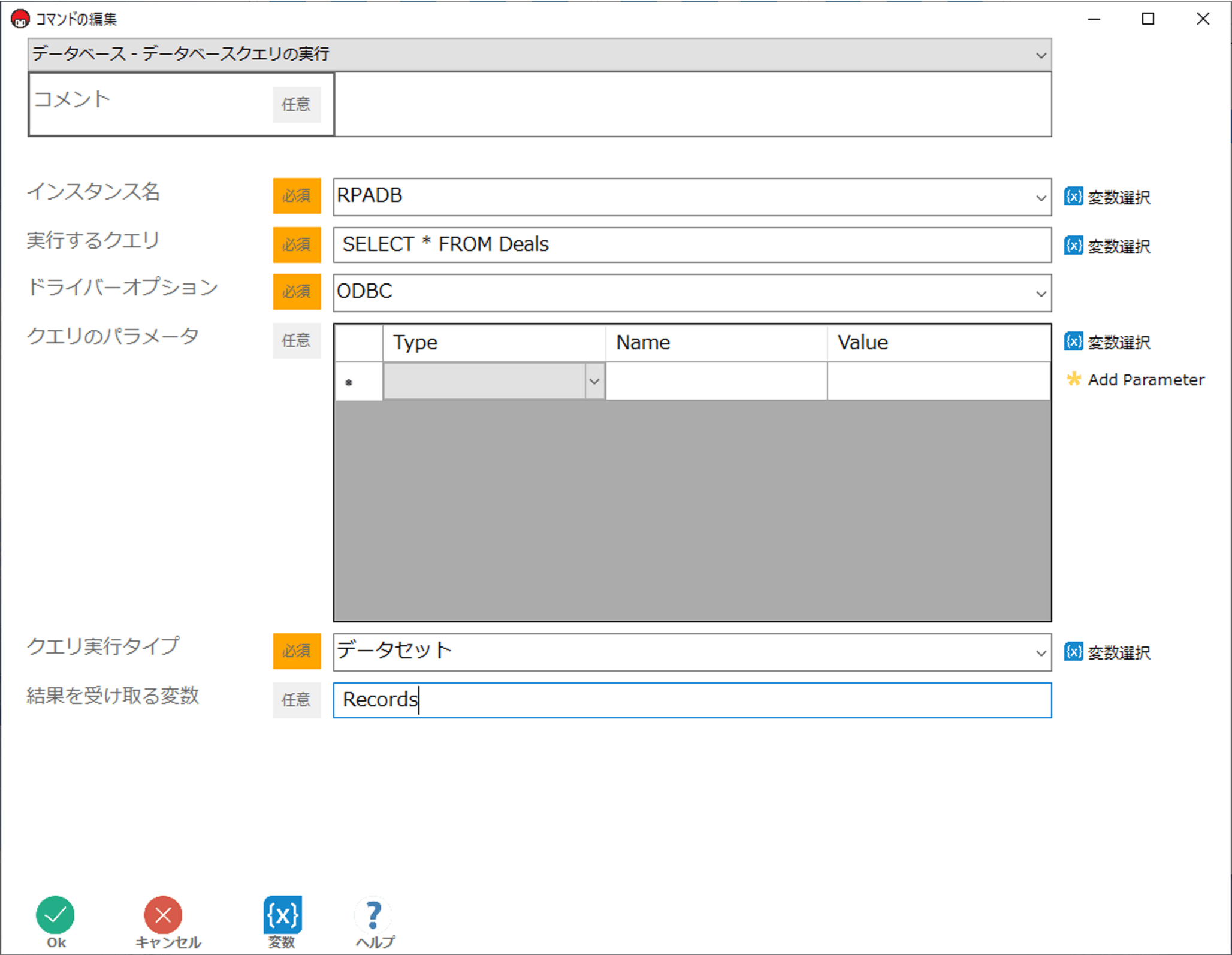 クエリ実行タイプは「データセット」とし、クエリした結果を受け取る変数に予め作成しておいたユーザー変数の「Records」を指定しました。