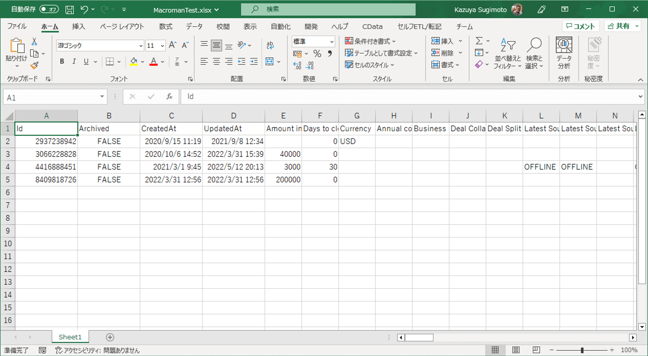 Excel ファイルにうまく出力されていました。このようにExcel で日々の商談状況のレポートなどの作成にも繋げられますね。
