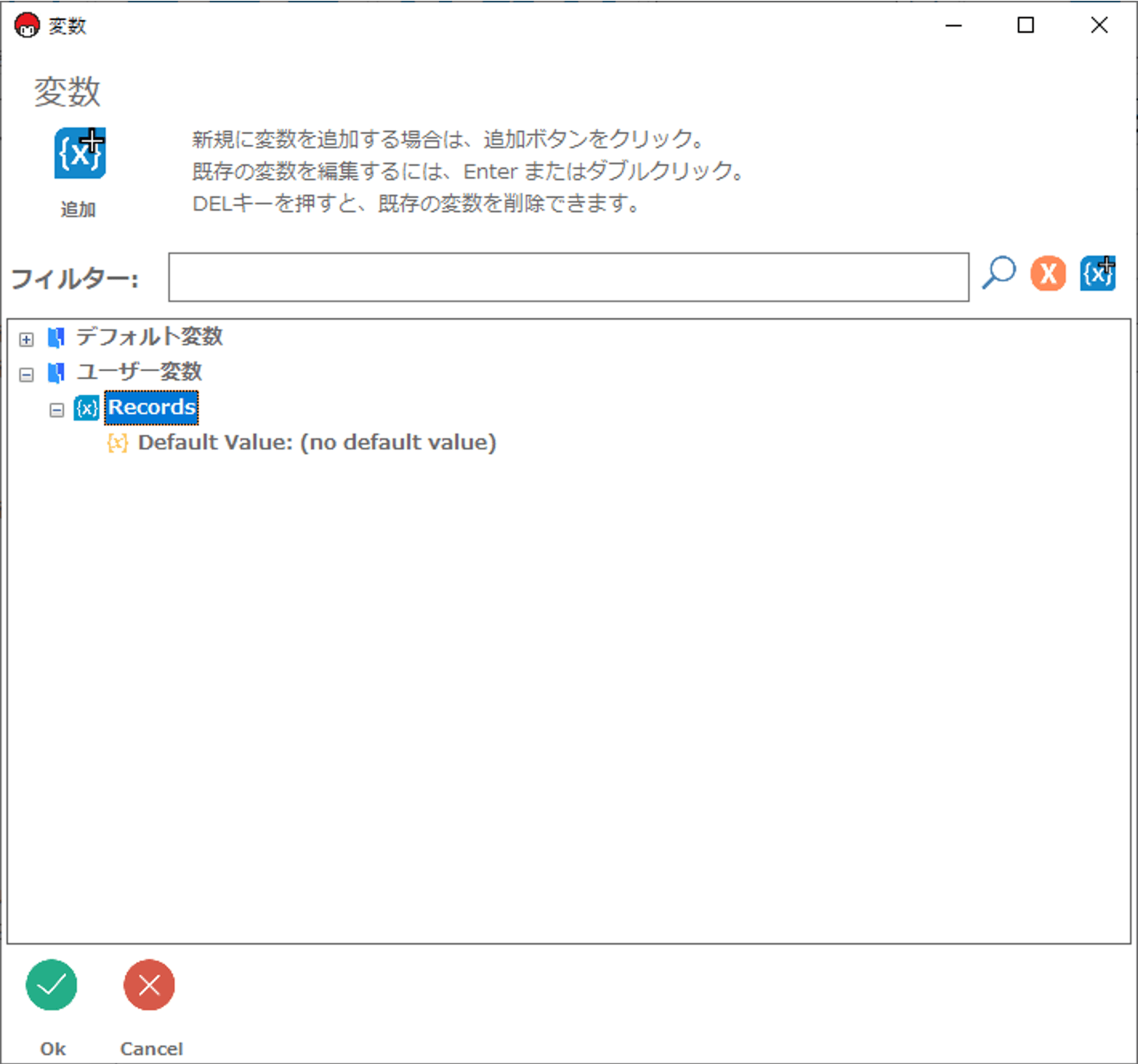 名前は任意のもので構いません。私の環境では「Records」という変数を作成しました。