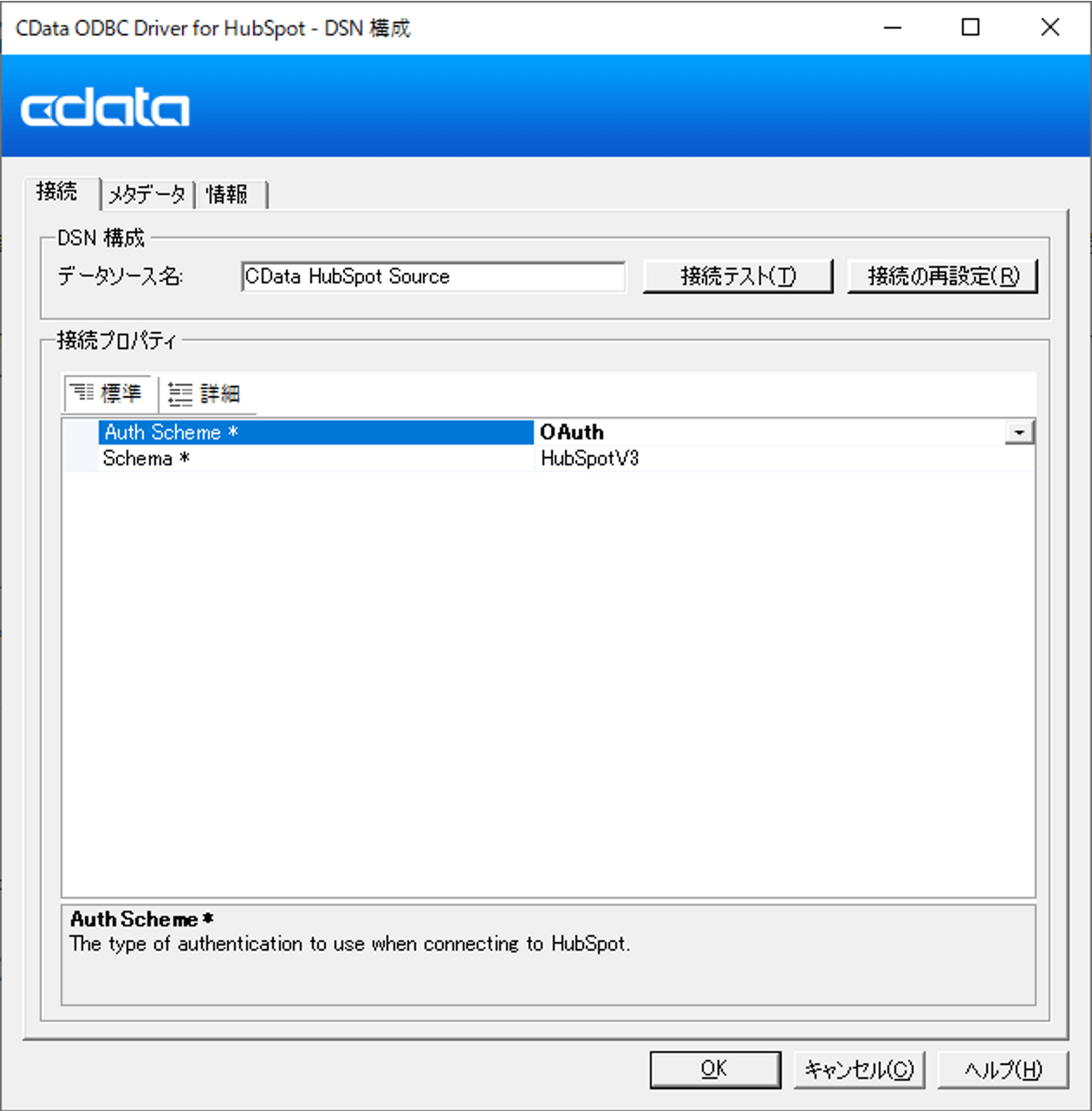 セットアップが完了すると、以下のような画面が表示されるので、「Auth Scheme」で「OAuth」を選択し、