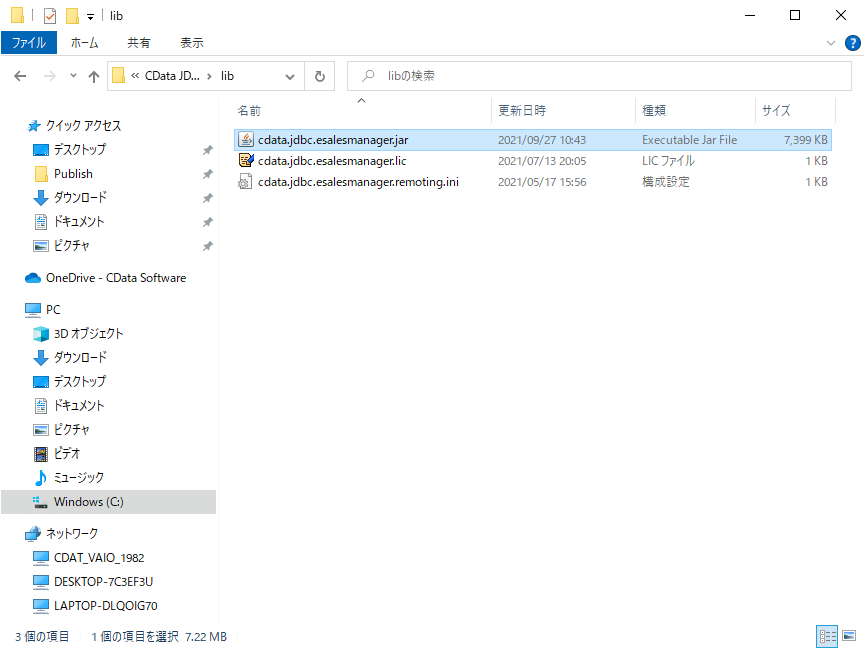 インストール完了後、「C:\Program Files\CData\CData JDBC Driver for e-Sales Manager Remix 2021J\lib」のフォルダに移動して「cdata.jdbc.esalesmanager.jar」を実行しましょう。