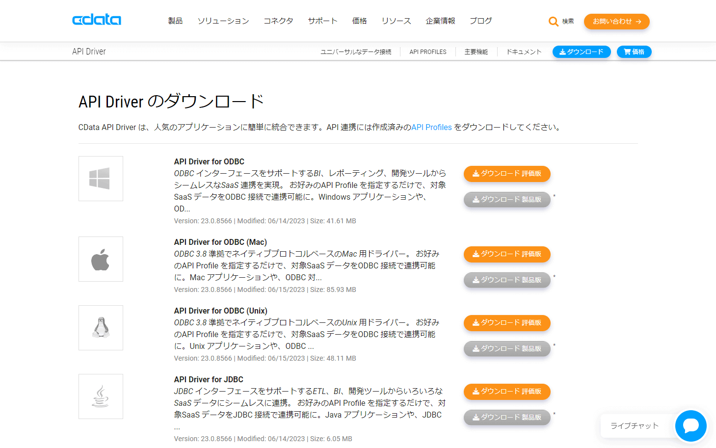 まず、CData API ODBC Driver の30日間の評価版をダウンロードします。ダウンロードの際には、Emailの登録が必要となります。