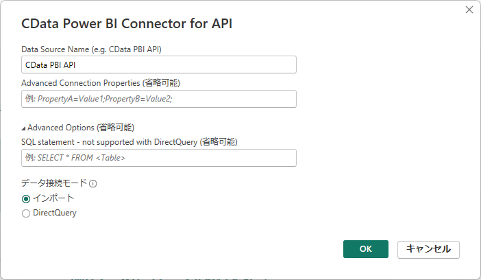 最初に接続するためのウィザードが表示されるので、「CData API Driverのインストール」の内容と同様に各種パラメータを入力します。