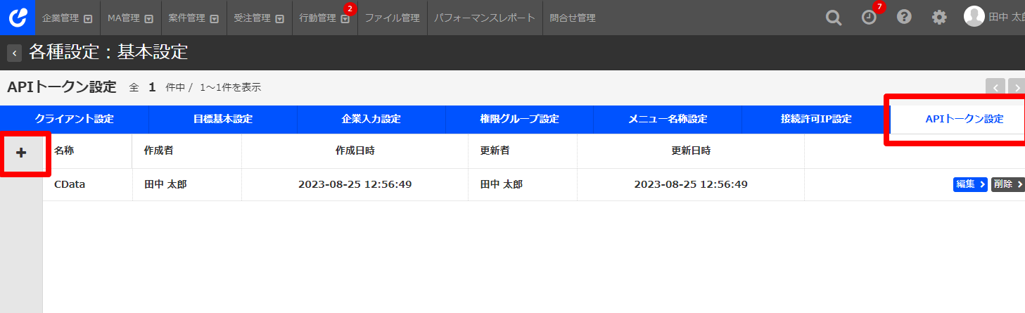 続いて「APIトークン」のページに移動し、「+」ボタンをクリックします。