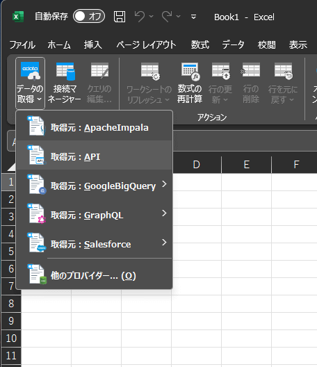 CData Excel Add-in for API をインストール後、Excelを立ち上げるとCDataタブが追加されていることがわかります。このタブから各種操作を実施します。