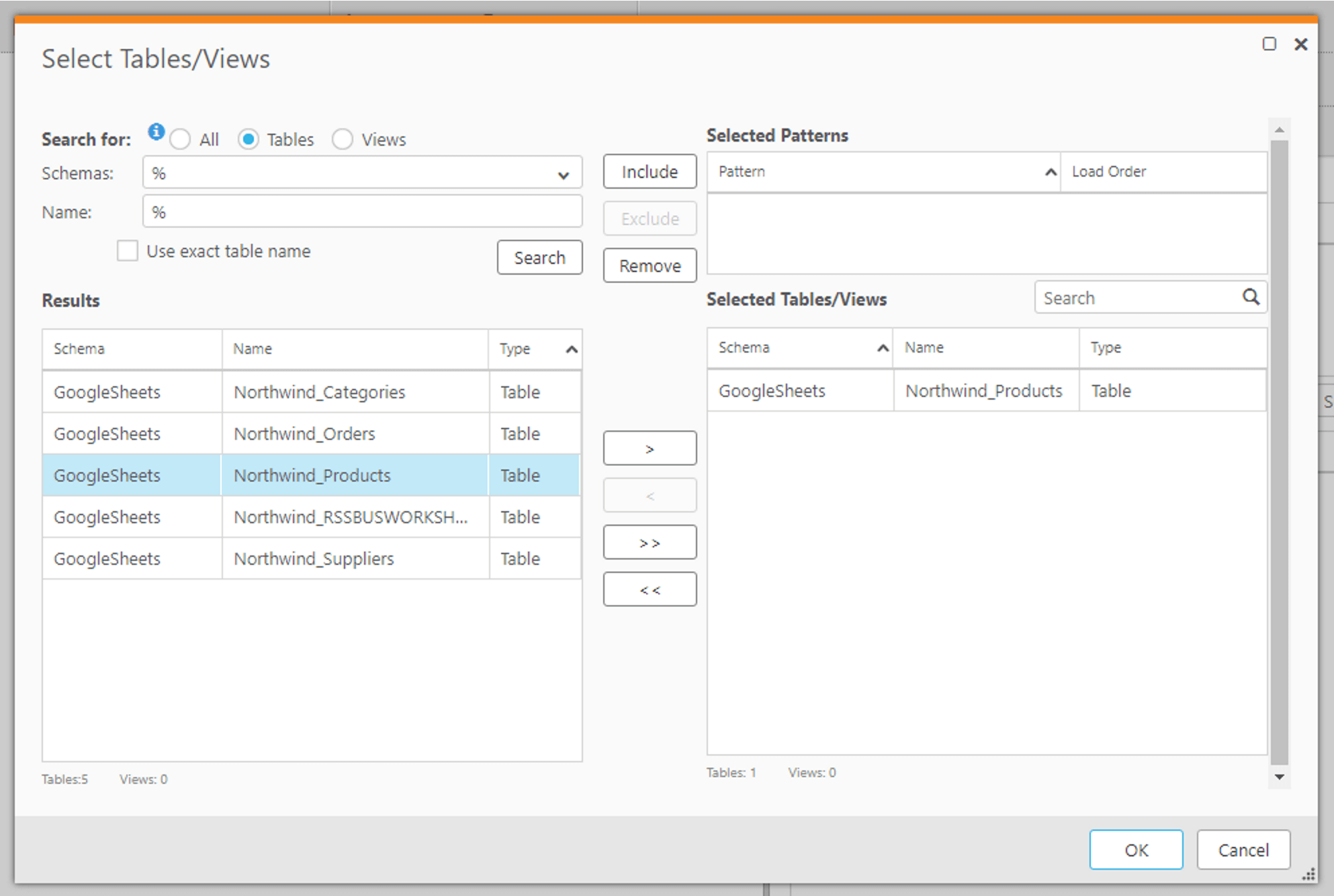 「Search」をクリックして、対象となるテーブルを検索します。