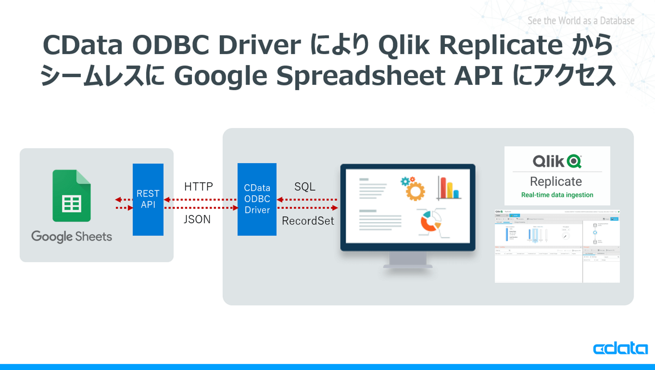 そのリクエストを受け取った、CData Google Spreadsheet ODBC Driverは、SQL文を解析し、Google Spreadsheet の Web API のエンドポイントに対してHTTPリクエスト形式に変換して発行、レスポンスをQlik Replicate に返却します。