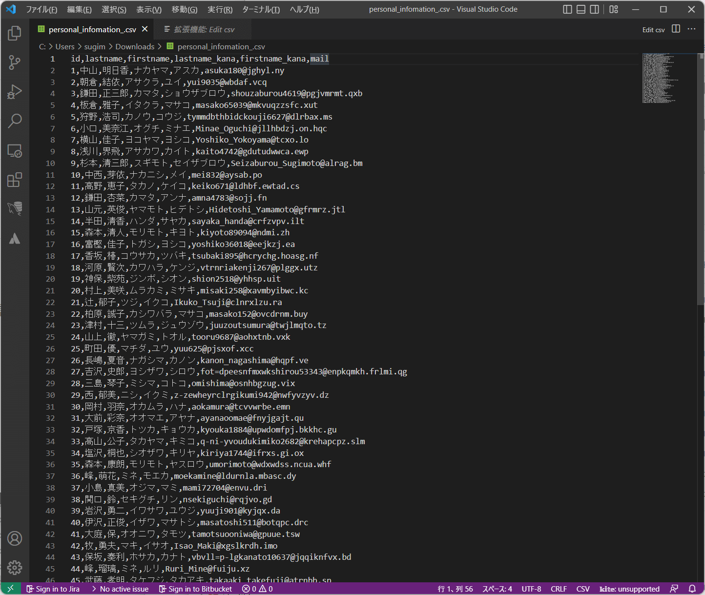各種クラウドサービスから取得するデータを想定して、HIRAMEKI XDに取り込むためのCSVファイルのテンプレートを作っておきましょう。今回は以下のようなファイルを用意してみました。