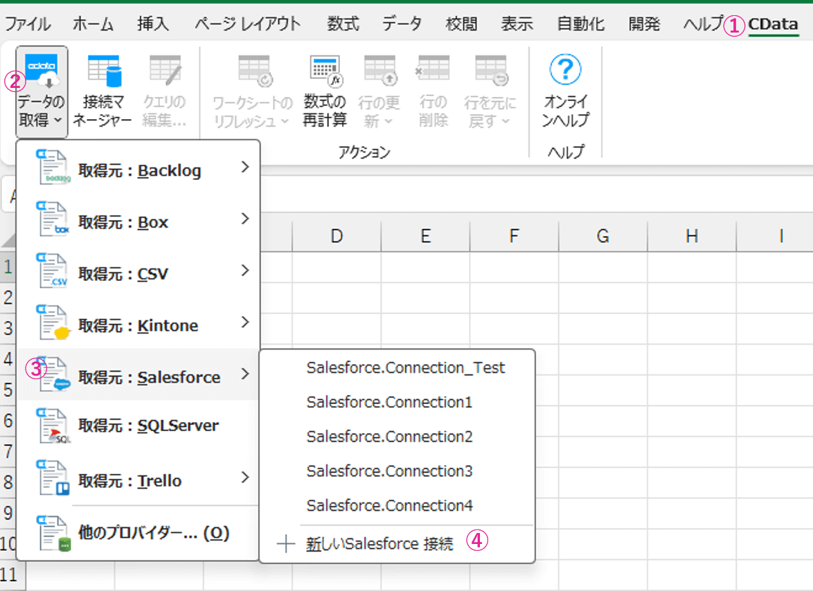 Excel Add-In for Salesforce をインストールしたマシンで、Excel を開き、①CData タブ>②データの取得>③取得元:Salesforce>④+新しいSalesforce 接続にいきます。