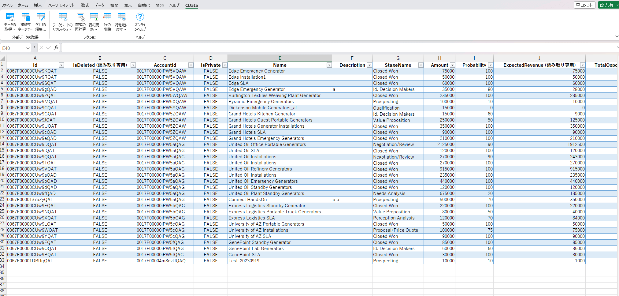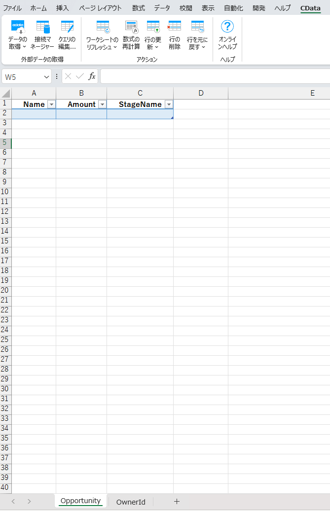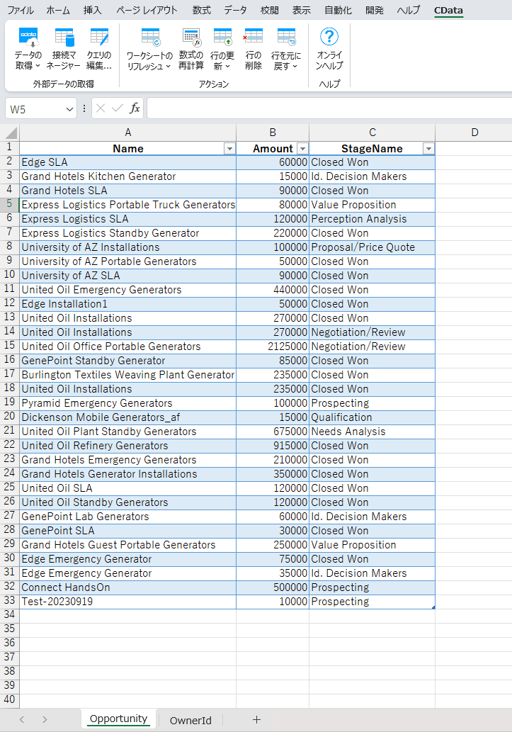 SQL クエリに入力後、OKすると、Opportunity のシートに指定したカラムのみが表示されます。