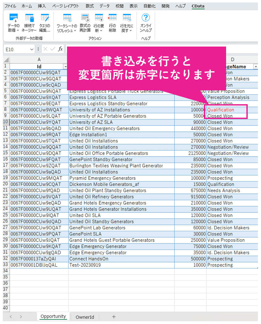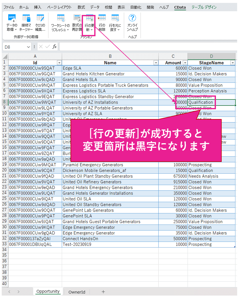 これでSalesforce を都度開かずとも、使い慣れたExcel から営業担当者の商談フェーズを更新することができるようになります。便利ですね。