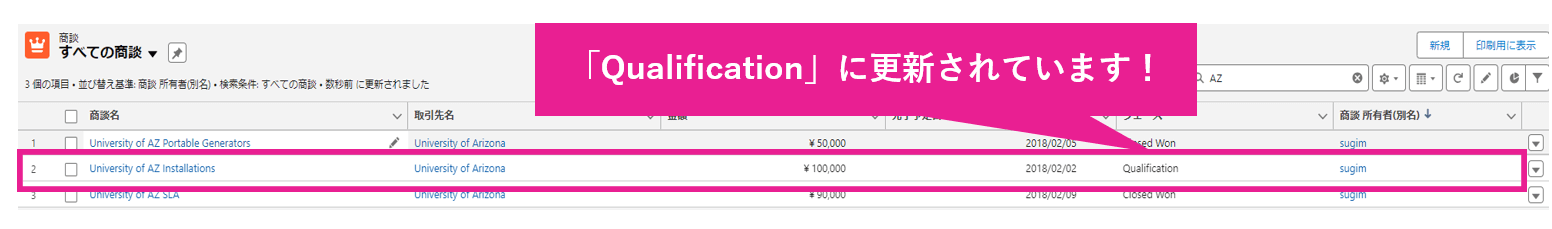 Excel で更新した商談のStageName(フェーズ)がきちんと「Qualification」に変更されていました。