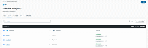 「+タスクを追加」をクリックすると、Salesforce のどのオブジェクトのデータをデータ同期したいか選ぶことができます。今回は、Account、Opportunity、Customer のデータをPostgreSQLにレプリケートしたいと思います。