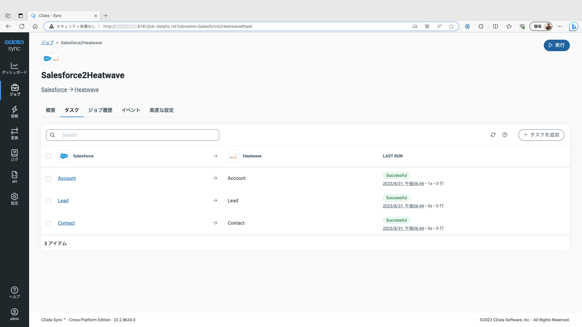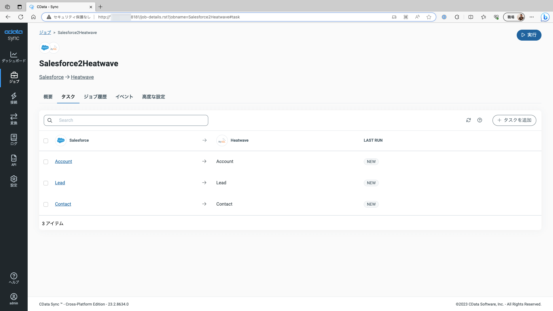 それではCData Syncの管理コンソールに戻り、手動でもう一度ジョブを実行してみましょう。右上の「▶️実行」ボタンをクリックします。タスクの各レコードのLAST RUNの行数を見ると全て0行となっています。これは、デフォルトでは2回目以降の実行では差分抽出&更新されるためです。