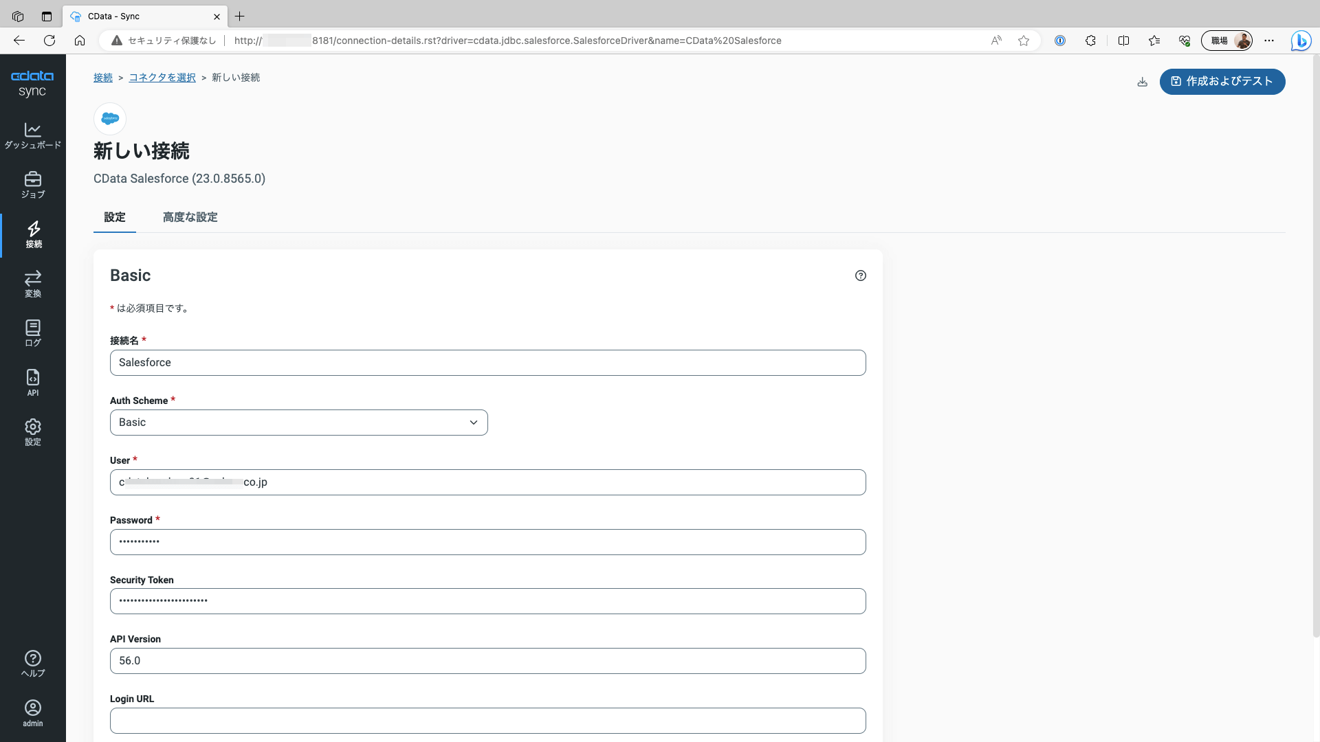 Salesforceへの接続情報をセットします。CData SyncではOAuthやBasicなど様々な認証方式をサポートしています。詳細はこちらの製品ヘルプをご参照ください。本手順では「ユーザー資格情報およびセキュリティトークン」の方式でSalesforceに接続します。