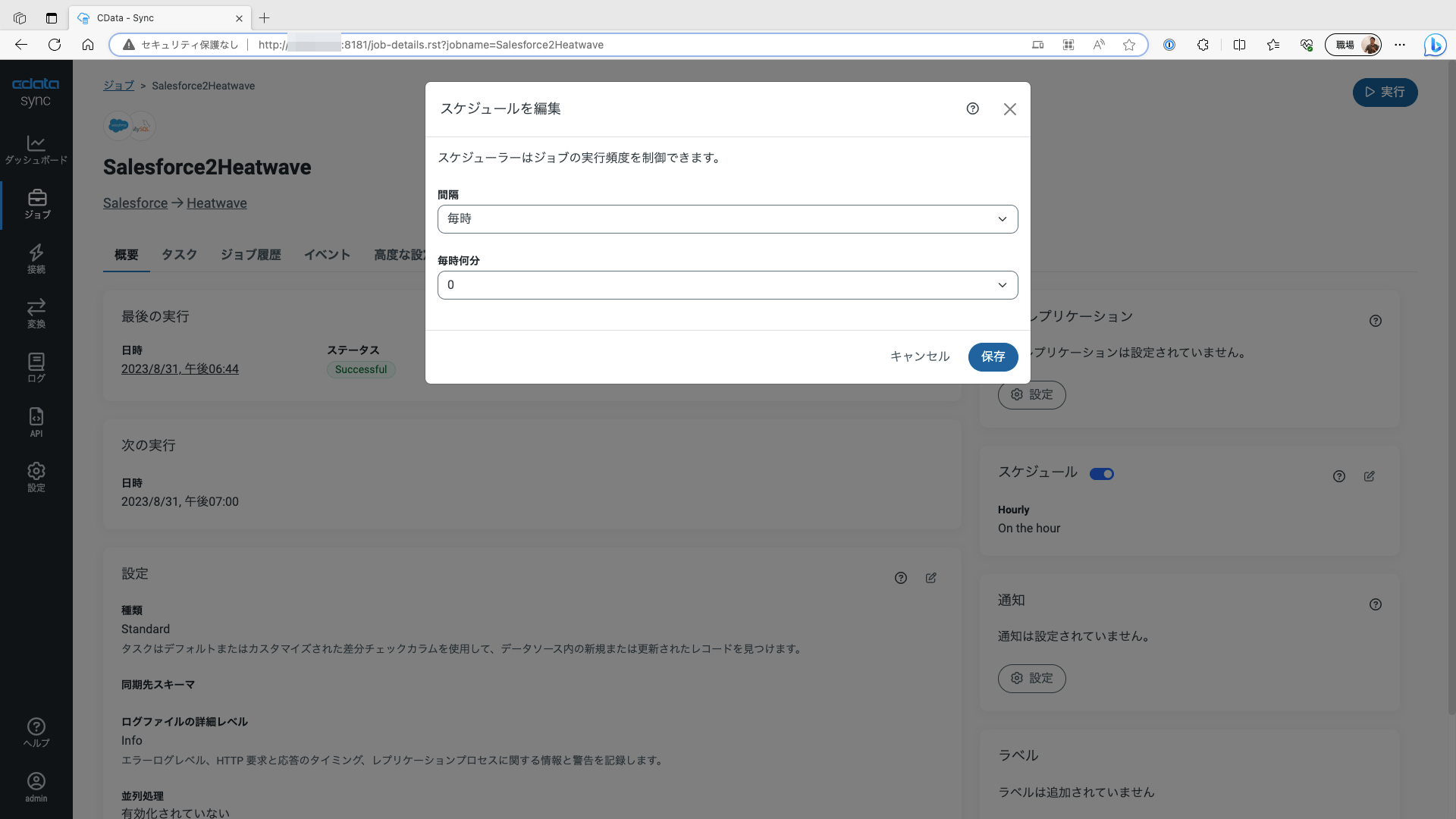 スケジュールを編集ダイアログが開くので例えば1時間毎(毎時ゼロ分)にジョブを実行する場合は間隔が「毎時」、毎時何分には「0」をセットして保存します。