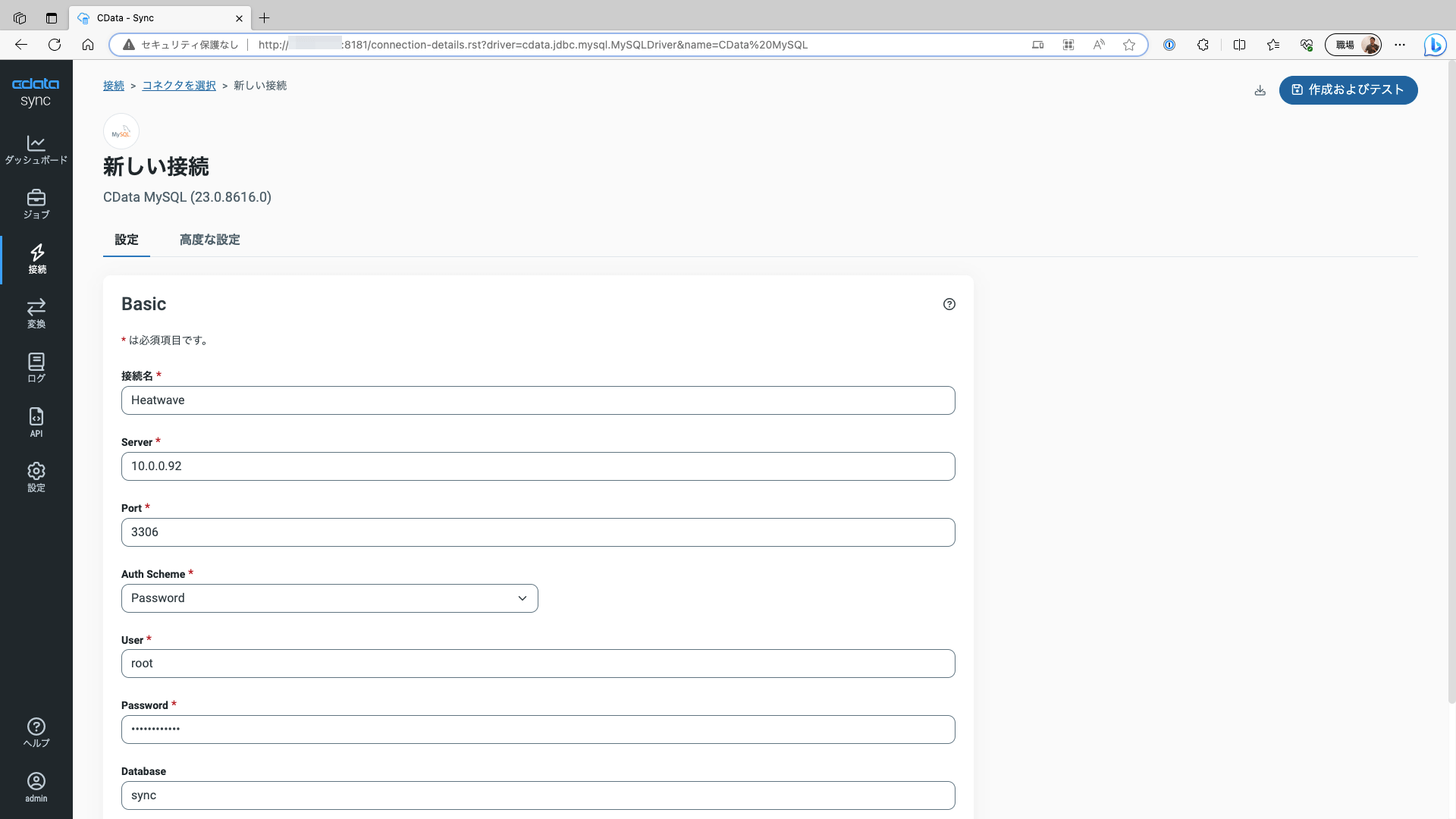 MySQL Heatwaveへの接続情報をセットします。OCIインスタンス上のCData SyncからMySQL HeatwaveにはプライベートIPアドレスで接続します。