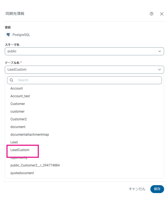 同期先情報から、先ほど確認したPostgreSQLに入っている既存のテーブル【LeadCustom】を選びます。