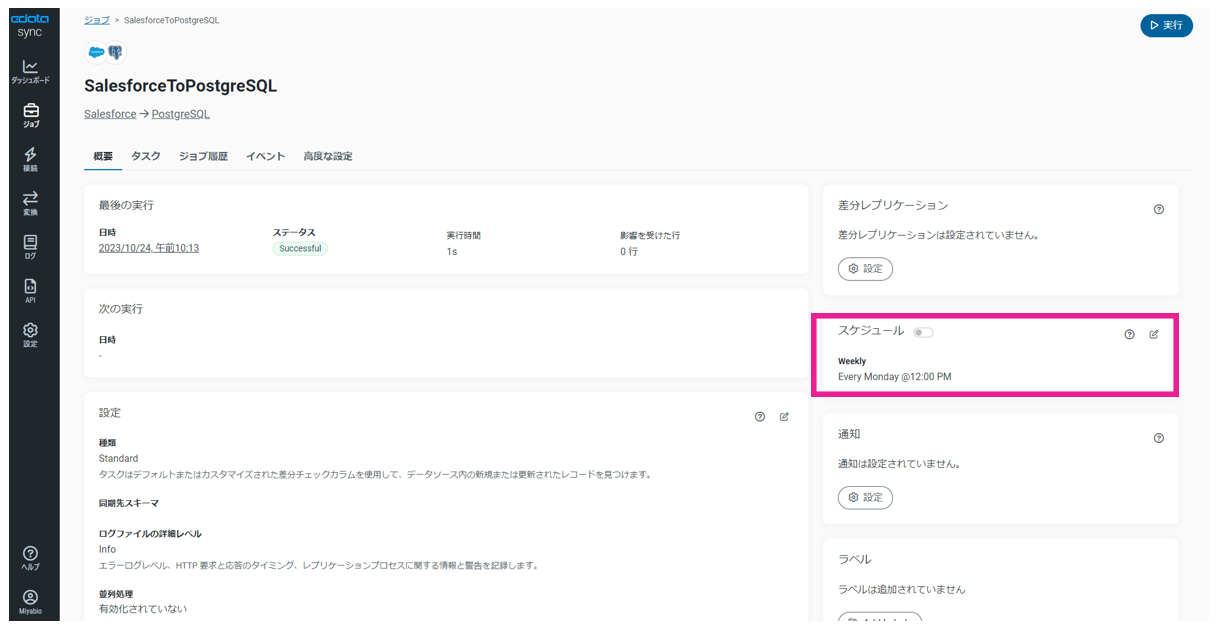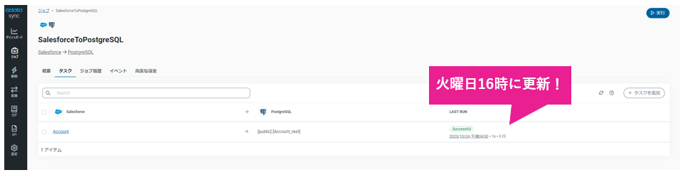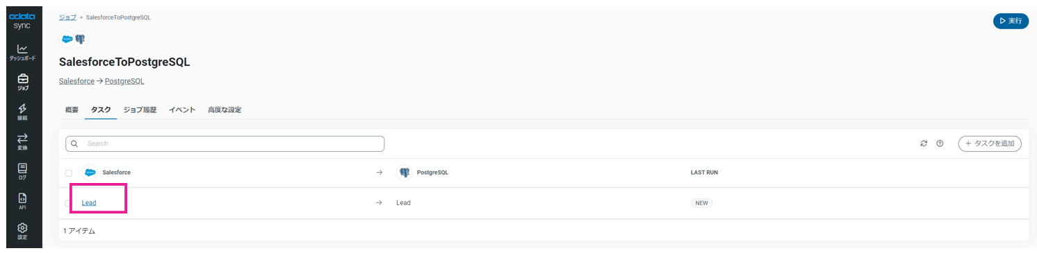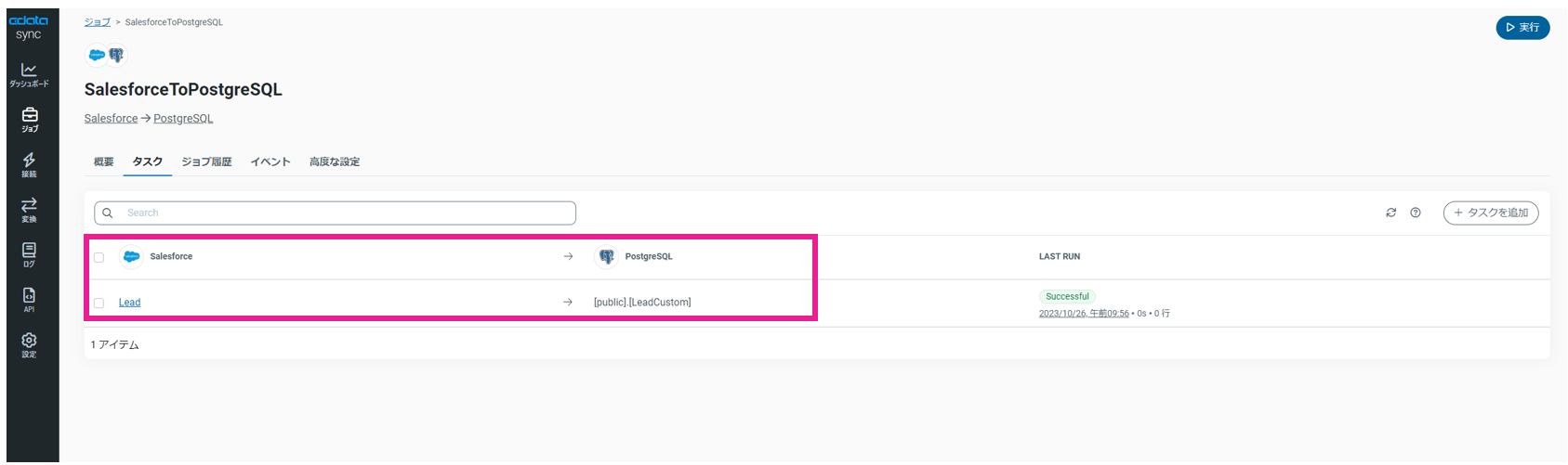 そうすることで、タスク実行画面に戻ると、Salesforce のLead 情報をPostgreSQLの【LeadCustom】にレプリケーションすることができるように設定できます!