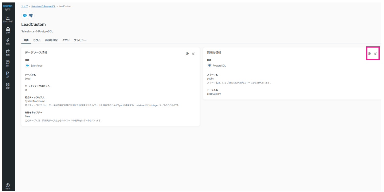 CData Sync の[ジョブ]タブ→[タスク]タブから、【Lead】 のオブジェクトを選んで下記の画面へいきます。そして、青色文字の【Lead】 を押していただくと、