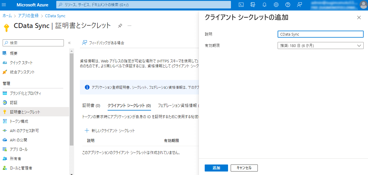 証明書とシークレットのクライアントシークレットで、「新しいクライアントシークレット」をクリックし、「追加」をクリックします。