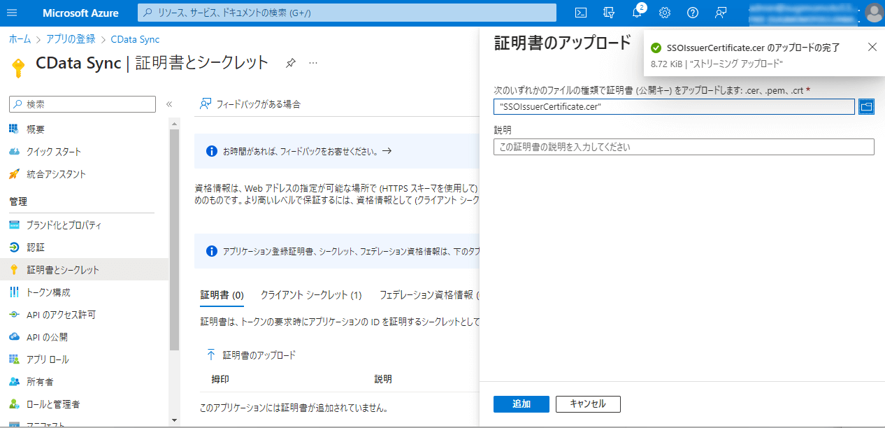 「証明書のアップロード」をクリックし、証明書を選択して、「追加」をクリックします。
