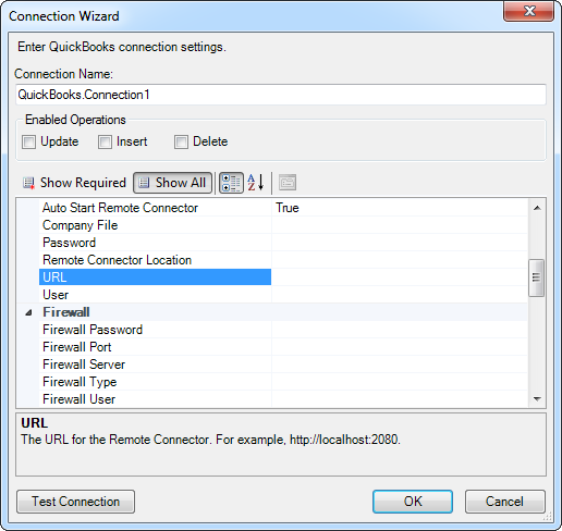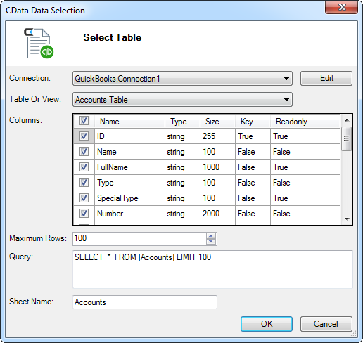 2つの QuickBooks 会社への接続を作成します。新しい接続を作成するには、CData リボンの「From QuickBooks」ボタンをクリックし、Data Selection ダイアログで「Edit」をクリックします。表示される接続ウィザードで、更新と挿入を有効にしてください。